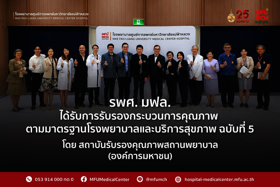 "โรงพยาบาลศูนย์การแพทย์มหาวิทยาลัยแม่ฟ้าหลวง เป็นสถานพยาบาลที่ได้รับการรับรองกระบวนการคุณภาพตามมาตรฐานโรงพยาบาลและบริการสุขภาพ ฉบับที่ 5"