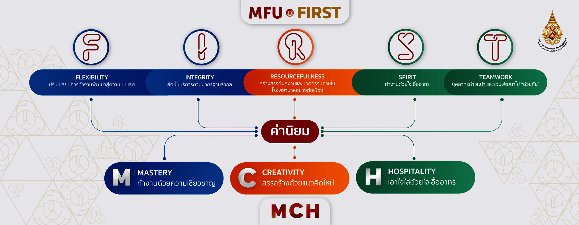 MCH ค่านิยมของโรงพยาบาลศูนย์การแพทย์มหาวิทยาลัยแม่ฟ้าหลวง ที่เชื่อมโยงการดำเนินงานตามค่านิยม MFU FIRST และมุ่งพัฒนาองค์กรตามวิสัยทัศน์และเป้าประสงค์ของการจัดตั้งโรงพยาบาลศูนย์การแพทย์มหาวิทยาลัยแม่ฟ้าหลวง