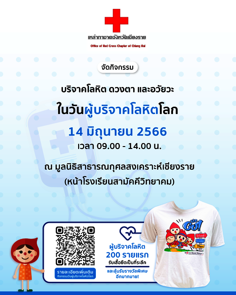 - ผู้บริจาคโลหิต 200 รายแรก - รับเสื้อยืดเป็นที่ระลึกและลุ้นรับรางวัลพิเศษ