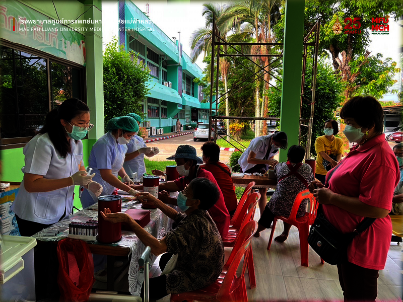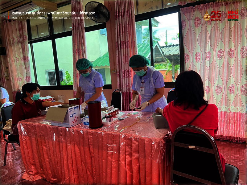 งานส่งเสริมสุขภาพชุมชน ร่วมกับงานพยาธิวิทยา โรงพยาบาลศูนย์การแพทย์มหาวิทยาลัยแม่ฟ้าหลวง ได้ดำเนินงานการเฝ้าระวังโรคไม่ติดต่อ ตรวจคัดกรองผู้ป่วยเบาหวาน และความดันโลหิต โดยออกให้บริการเจาะเลือดประจำปี แก่ประชาชนในพื้นที่เขตความรับผิดชอบของโรงพยาบาลศูนย์การแพทย์ มฟล. 3 ตำบล ได้แก่ ตำบลท่าสุด ตำบลนางแล ตำบลแม่ข้าวต้ม ระหว่างวันที่ 6 - 28 มิถุนายน 2566