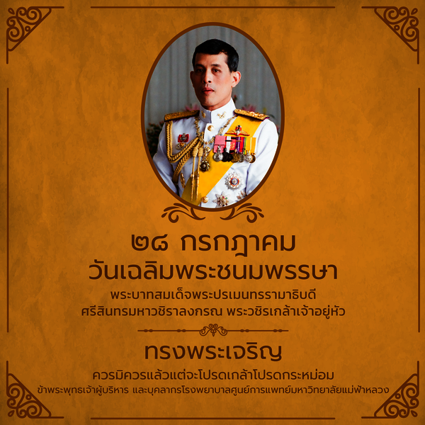 28 กรกฎาคม วันเฉลิมพระชนมพรรษาพระบาทสมเด็จพระปรเมนทรรามาธิมดีศรีสินทรมหาวชิราลงกรณ พระวชิรเกล้าเจ้าอยู่หัว