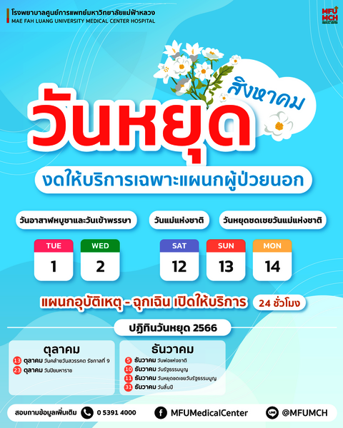 เว็บไซต์โรงพยาบาลศูนย์การแพทย์มหาวิทยาลัยแม่ฟ้าหลวงใช้คุกกี้เพื่อเพิ่มประสบการณ์และความพึงพอใจในการใช้งานเว็บไซต์ หากคุณกด “Accept” หรือใช้งานเว็บไซต์ของเราต่อ ถือว่าคุณยินยอมให้มีการใช้งานคุกกี้ ประกาศเกี่ยวกับความเป็นส่วนตัว