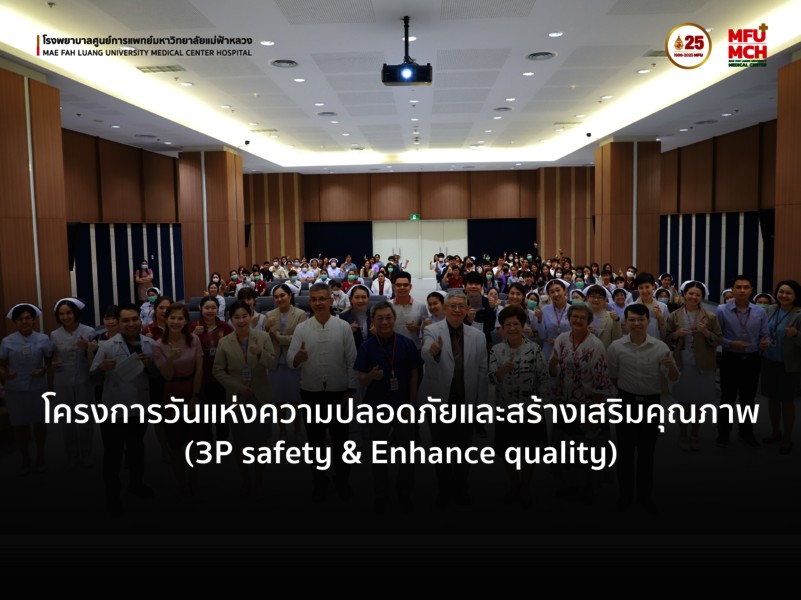 26 กันยายน 2566 โรงพยาบาลศูนย์การแพทย์มหาวิทยาลัยแม่ฟ้าหลวง ได้จัดโครงการวันแห่งความปลอดภัยและสร้างเสริมคุณภาพ (3P Safety & Enhance Quality) โดยมี ศาสตราจารย์คลินิก นายแพทย์อภิรักษ์ ช่วงสุวนิช รักษาการแทน ผู้อำนวยการโรงพยาบาลศูนย์การแพทย์มหาวิทยาลัยแม่ฟ้าหลวงเป็นประธานกล่าวเปิดงาน ภายในงานมีกิจกรรมส่งเสริมวัฒนธรรมความปลอดภัยและป้องกันความเสี่ยงของโรงพยาบาล และกิจกรรมการส่งเสริมพัฒนาผลงานนวัตกรรมที่สร้างเสริมผลงานนวัตกรรม/ผลงานพัฒนาคุณภาพอย่างต่อเนื่องเพื่อระบบบริการสุขภาพที่ก้าวหน้าด้วยกรอบความคิดที่กว้างไกล (Enhance Potential Project to create Innovation & CQI : Growth mindset for better healthcare system) เพื่อเป็นการส่งเสริมให้กับหน่วยงานของโรงพยาบาลศูนย์การแพทย์ฯ ในด้านการบริการจัดการความเสี่ยง และส่งเสริมให้เกิดการพัฒนาผลงาน เพื่อให้เป็นไปตามเป้าหมายการดำเนินงานพัฒนาคุณภาพ และสื่อสารผลลัพธ์ของการดำเนินงานคุณภาพของโรงพยาบาล และในช่วงท้ายของงานมีกิจกรรมรับประทานอาหารร่วมกันของบุคลากรภายในโรงพยาบาล