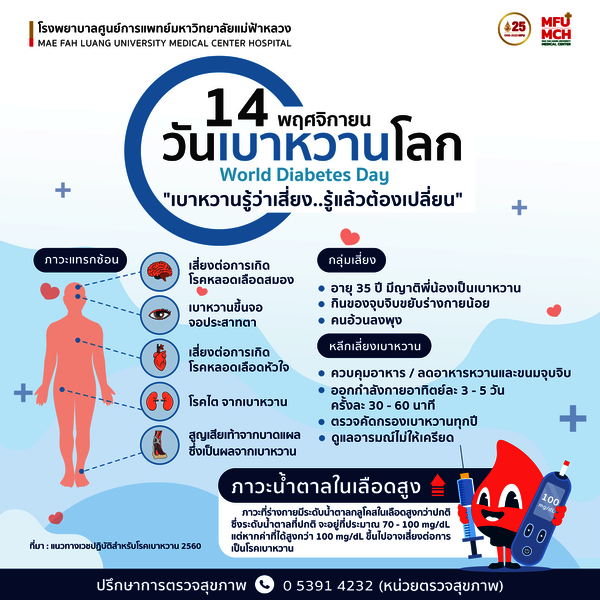 "วันเบาหวานโลก" ถูกจัดขึ้นเพื่อสร้างความตระหนักและความสำคัญถึงโรคเบาหวาน ซึ่งเพิ่มขึ้นอย่างมากทั่วโลก โดยคำขวัญวันเบาหวานโลก ประจำปี 2566 คือ "เบาหวานรู้ว่าเสี่ยง.. รู้แล้วต้องเปลี่ยน" หากท่านมีความกังวลเกี่ยวกับสุขภาพของท่าน หรือ มีพฤติกรรมเสี่ยง สามารถมาปรึกษาหรือรับบริการตรวจสุขภาพ ได้ที่โรงพยาบาลของเรา