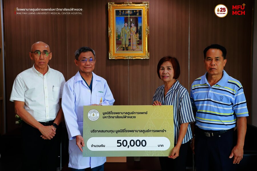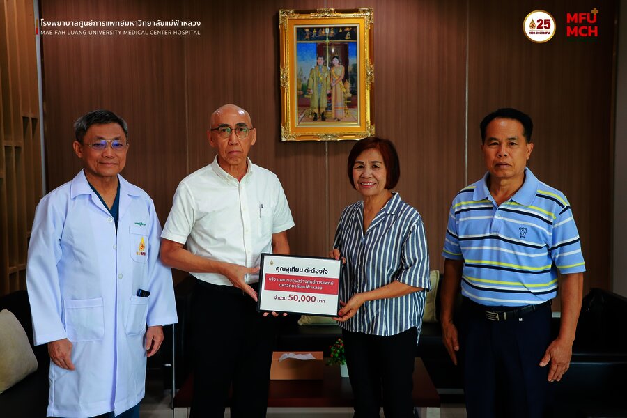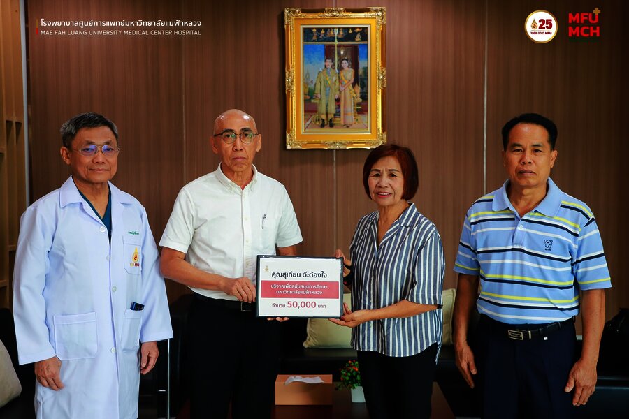 รศ.ชุษณะ รุ่งปัจฉิม รักษาการแทนผู้อำนวยการศูนย์การแพทย์ มหาวิทยาลัยแม่ฟ้าหลวง และ ศ.นพ.อภิรักษ์ ช่วงสุวนิช รักษาการแทนผู้อำนวยการโรงพยาบาลศูนย์การแพทย์มหาวิทยาลัยแม่ฟ้าหลวง รับมอบเงินบริจาค จำนวน 150,000 บาท โดยคุณเทียน ต๊ะต้องใจ และร้อยตำรวจเอก เอนก ต๊ะต้องใจ เป็นผู้แทนส่งมอบเงินบริจาคของคุณสุเทียน ต๊ะต้องใจ ตามความประสงค์ของผู้วายชน เพื่อสนับสนุนการดำเนินงานของม??าวิทยาลัยแม่ฟ้าหลวง และโรงพยาบาลศูนย์การแพทย์มหาวิทยาลัยแม่ฟ้าหลวง ณ สำนักงานบริหารศูนย์การแพทย์ ชั้น 2 อาคารศูนย์การแพทย์ โรงพยาบาลศูนย์มหาวิทยาลัยแม่ฟ้าหลวง