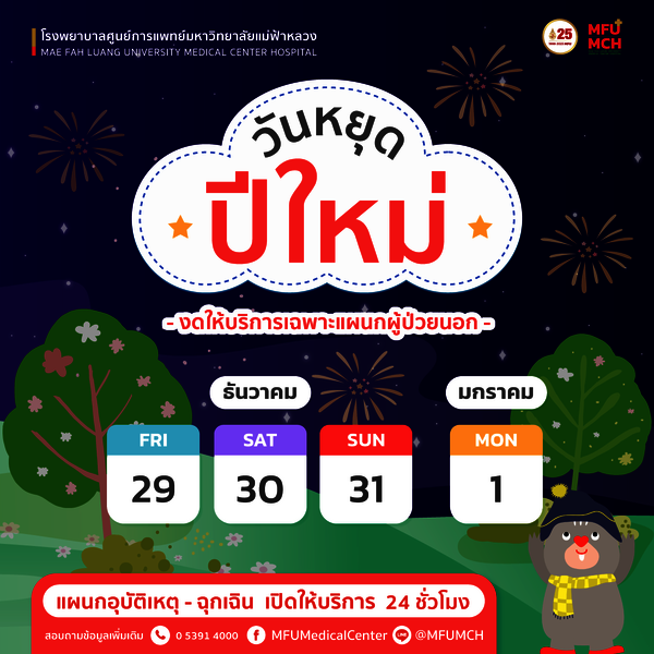 เว็บไซต์โรงพยาบาลศูนย์การแพทย์มหาวิทยาลัยแม่ฟ้าหลวงใช้คุกกี้เพื่อเพิ่มประสบการณ์และความพึงพอใจในการใช้งานเว็บไซต์ หากคุณกด “Accept” หรือใช้งานเว็บไซต์ของเราต่อ ถือว่าคุณยินยอมให้มีการใช้งานคุกกี้ ประกาศเกี่ยวกับความเป็นส่วนตัว