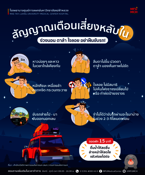 วนกลับมาถึงช่วงวันหยุดยาวเทศกาลปีใหม่อีกครั้ง หลายๆท่านคงออกเดินทางเพื่อกลับบ้าน หรือ ไปเที่ยวกันในช่วงสุดสัปดาห์นี้ รพศ.มฟล. จึงนำสัญญาณเตือนที่อาจทำให้เกิดอาการหลับในที่อาจเกิดขึ้นได้กับทุกคนที่ขับรถเป็นเวลานาน มาแบ่งปันกัน