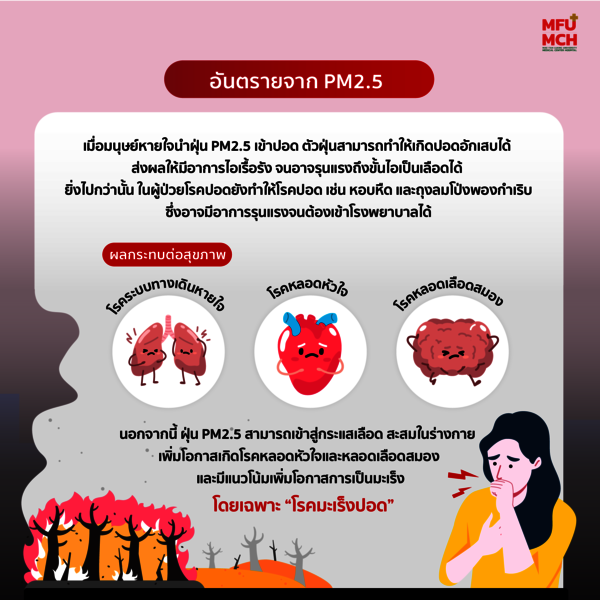 นอกจากนี้ ฝุ่น PM2.5 ยังสามารถเข้าสู่กระแสเลือด สะสมในร่างกาย เพิ่มโอกาสเกิดโรคหลอดเลือดหัวใจและหลอดเลือดสมอง เพิ่มความเสี่ยงต่อการเสียชีวิตในระยะยาว และมีแนวโน้มเพิ่มโอกาสการเป็นมะเร็ง โดยเฉพาะมะเร็งปอด