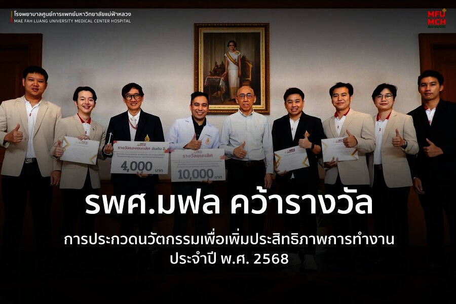 ในการนี้ บุคลากรจากโรงพยาบาลศูนย์มหาวิทยาลัยแม่ฟ้าหลวงได้รับรางวัลจากผลงานนวัตกรรมที่ส่งเสริมการทำงานอย่างมีประสิทธิภาพและยั่งยืน สะท้อนถึงความมุ่งมั่นในการพัฒนาระบบบริการสุขภาพให้สอดคล้องกับยุทธศาสตร์ที่ 5 ของมหาวิทยาลัยฯ ด้านการบริหารจัดการทรัพยากรอย่างคุ้มค่าและสร้างคุณค่าเพิ่มในอนาคตอย่างยั่งยืน โดยเฉพาะกลยุทธ์ที่ 5.3 “การพัฒนากำลังคนสู่ความยั่งยืน” ตัวชี้วัดที่ 5.3 ซึ่งเน้นการสร้างนวัตกรรมที่สามารถนำไปใช้ประโยชน์ได้จริง