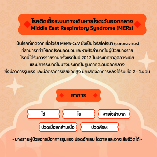 รู้จัก "โรคเมอร์ส" (MERS) หรือชื่อเต็มว่า Middle East Respiratory Syndrome คือโรคติดเชื้อทางเดินหายใจรุนแรง ที่เกิดจากเชื้อไวรัส MERS-CoV (เมอร์ส-โควี) ซึ่งอยู่ในกลุ่มเดียวกับไวรัสโคโรนา (Coronavirus)