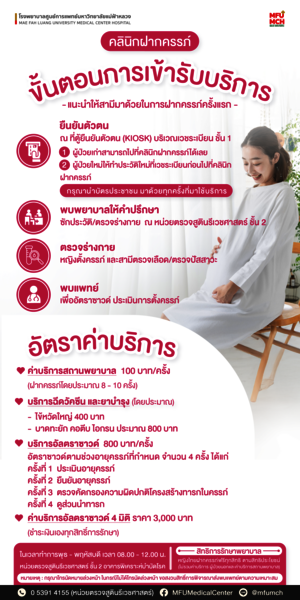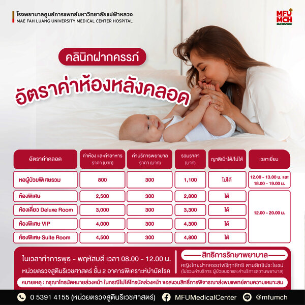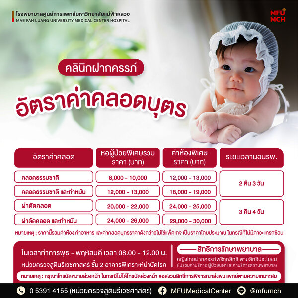โรงพยาบาลศูนย์การแพทย์มหาวิทยาลัยแม่ฟ้าหลวง (รพศ. มฟล.) พร้อมดูแลคุณแม่และลูกน้อยตั้งแต่เริ่มต้นจนถึงวันคลอด ด้วยทีมแพทย์ พยาบาล และบุคลากรทางการแพทย์ผู้เชี่ยวชาญ ที่พร้อมให้คำปรึกษาและดูแลคุณในทุกขั้นตอนของการตั้งครรภ์