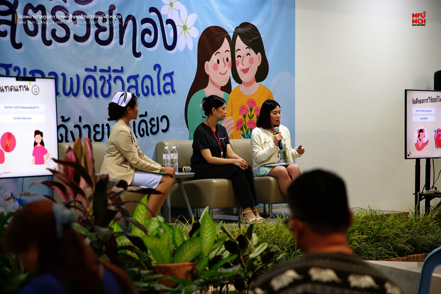 กิจกรรมวิชาการเริ่มด้วยการเสวนาและตอบคำถามหัวข้อ “วัยทองอย่างเข้าใจ : ฮอร์โมนเปลี่ยน แม่เปลี่ยนได้” โดย อาจารย์แพทย์หญิงชญานิษฐ์ คุณานุกุลวัฒนา และ อาจารย์แพทย์หญิงณัฏฐา ยศชนะ สูตินรีแพทย์ โรงพยาบาลศูนย์การแพทย์มหาวิทยาลัยแม่ฟ้าหลวง