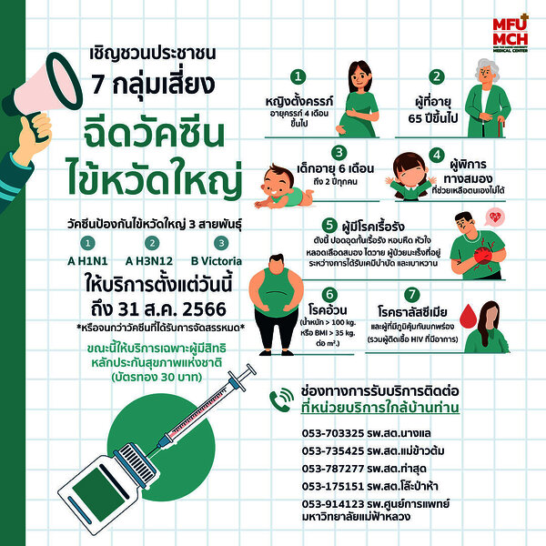 ขอเชิญชวนประชาชน 7 กลุ่มเสี่ยง "ฉีดวัคซีนป้องกันไข้หวัดใหญ่ 3 สายพันธุ์"